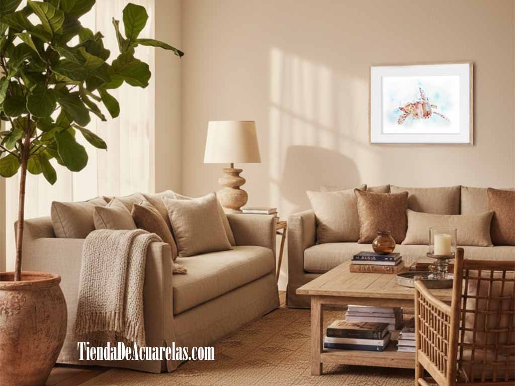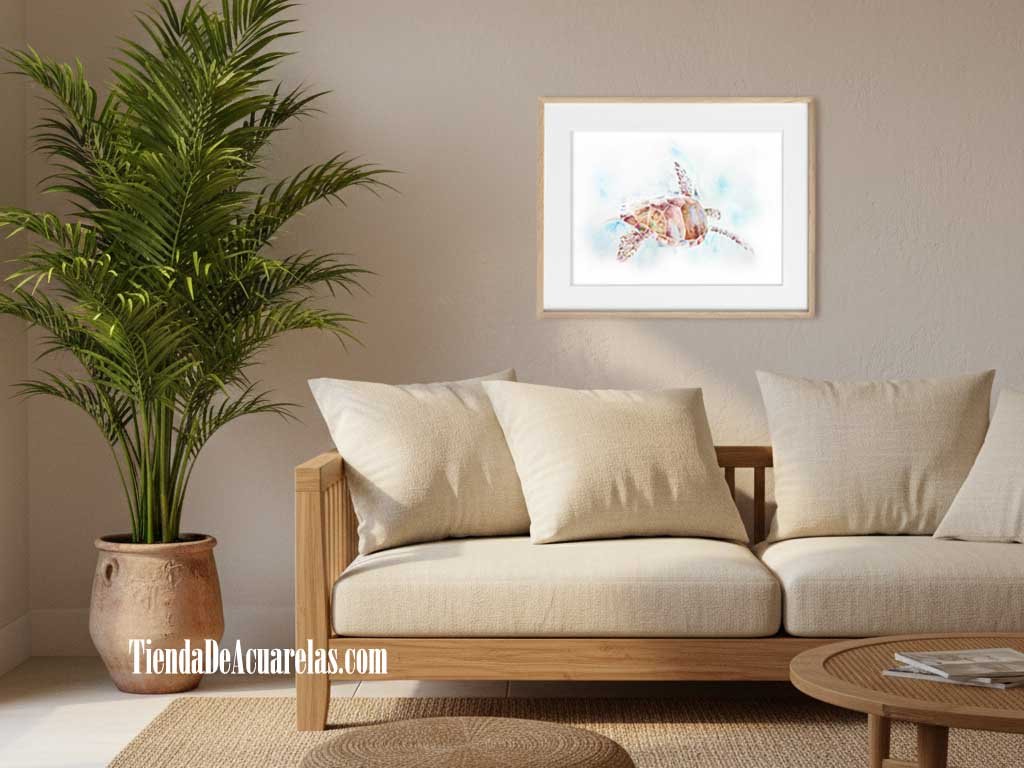 Sumérgete en la tranquilidad del océano con esta espectacular acuarela original de una Tortuga marina. La acuarela, técnica que juega con las transparencias y el movimiento del agua, esta pieza captura la elegancia de la vida marina en tonos ocres, tierras y azules cristalinos. ¡VENDIDA!