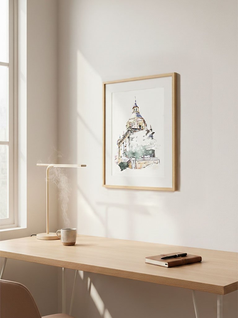 - Presentación: Se envía enmarcada únicamente con paspartú blanco de regalo (a menos que se especifique lo contrario), para que puedas elegir a tu gusto el tipo de marco y color del mismo. La recibirás dentro de una carpeta, lista para regalar si así lo deseas.
